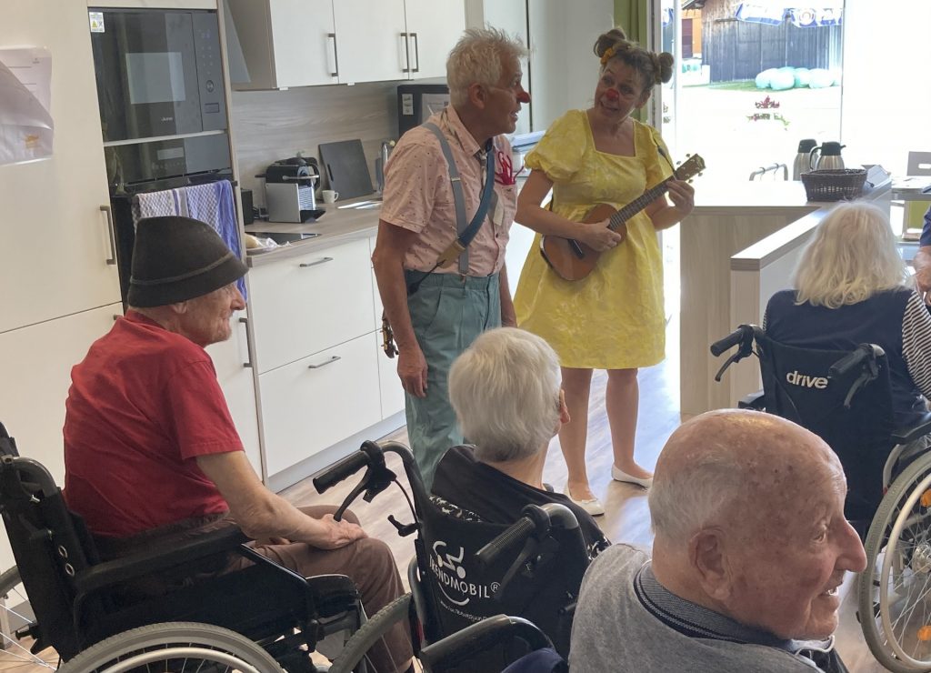 Wie ein kleines Kind ist er durchlässig. Wenn er den Raum betritt, spürt er und nimmt wahr. Emotionen der BewohnerInnen wie Kummer, Angst und Wut werden nicht mit wohlgemeinten Ratschlägen weggedrückt. Der Clown nimmt sie auf, „spielt“ mit ihnen und verwandelt sie mit seiner positiven Energie.